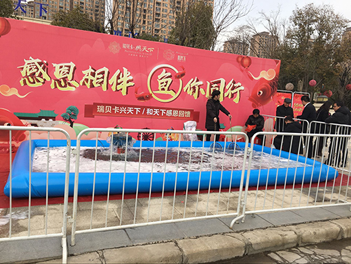 一大早,瑞貝卡興天下的售樓部便排起了長長的隊伍,人聲鼎沸而又熱鬧非凡,而作為此次活動的主角——鯉魚,也早早的被運到活動現場,活蹦亂跳的主角們在水塘里翻騰,而與此番景象交相輝映的是各位活動參與者臉上的愉悅神情。 大家看著充氣魚池里面又肥又大的鯉魚,紛紛表示:魚雖然算不上什么貴重的禮品,但是勝在營養(yǎng)豐富,重要的是有著美好寓意,所以新年伊始,大家都想借此討個吉祥討個喜氣。