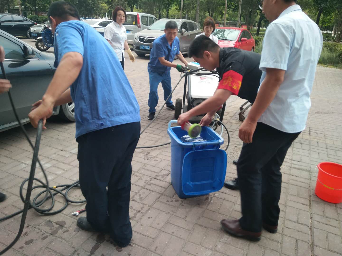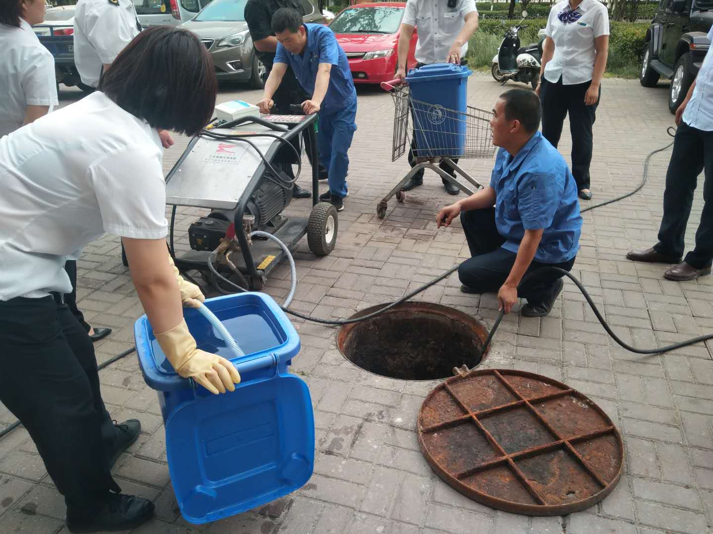 因停水,沒(méi)有水源可用管道疏通,客服班長(zhǎng)趙麗娟就與公維人員找來(lái)樓前的垃圾桶清洗后,將北門(mén)魚(yú)池內(nèi)的水,一桶一桶地運(yùn);工程、公維人員待疏通機(jī)到位后,就一點(diǎn)一點(diǎn)的疏通;客服部的姑娘們挽起腿褲與保潔人員,用掃帚一處一處的清理……