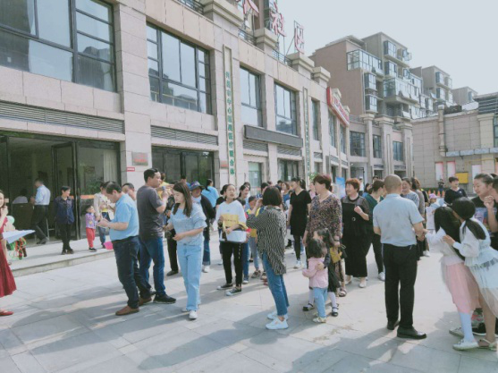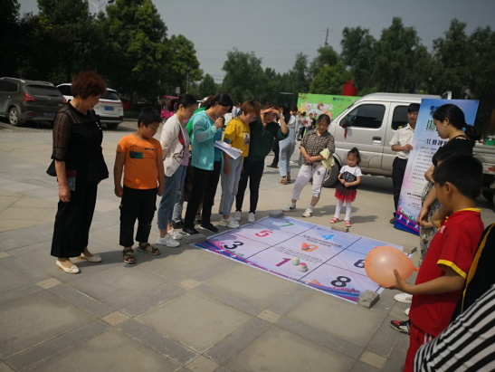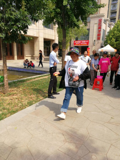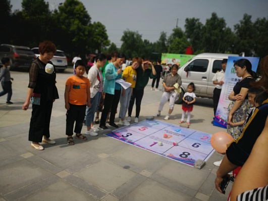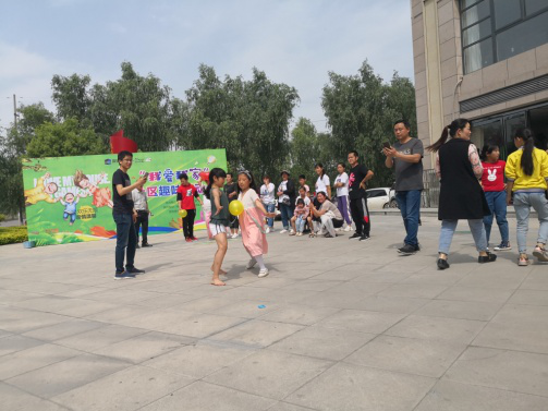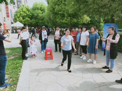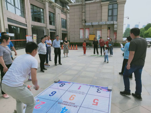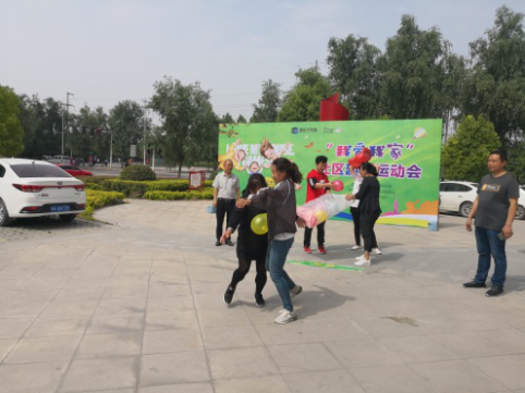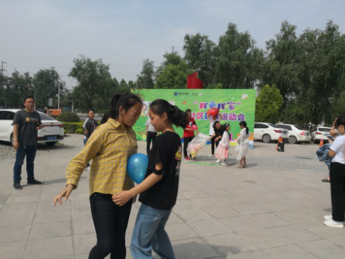 四個(gè)比賽項(xiàng)目同時(shí)開(kāi)始,心心相映與擲沙包在社區(qū)廣場(chǎng)舉行,筷子夾乒乓球與跳繩在售樓部門(mén)口舉行。
