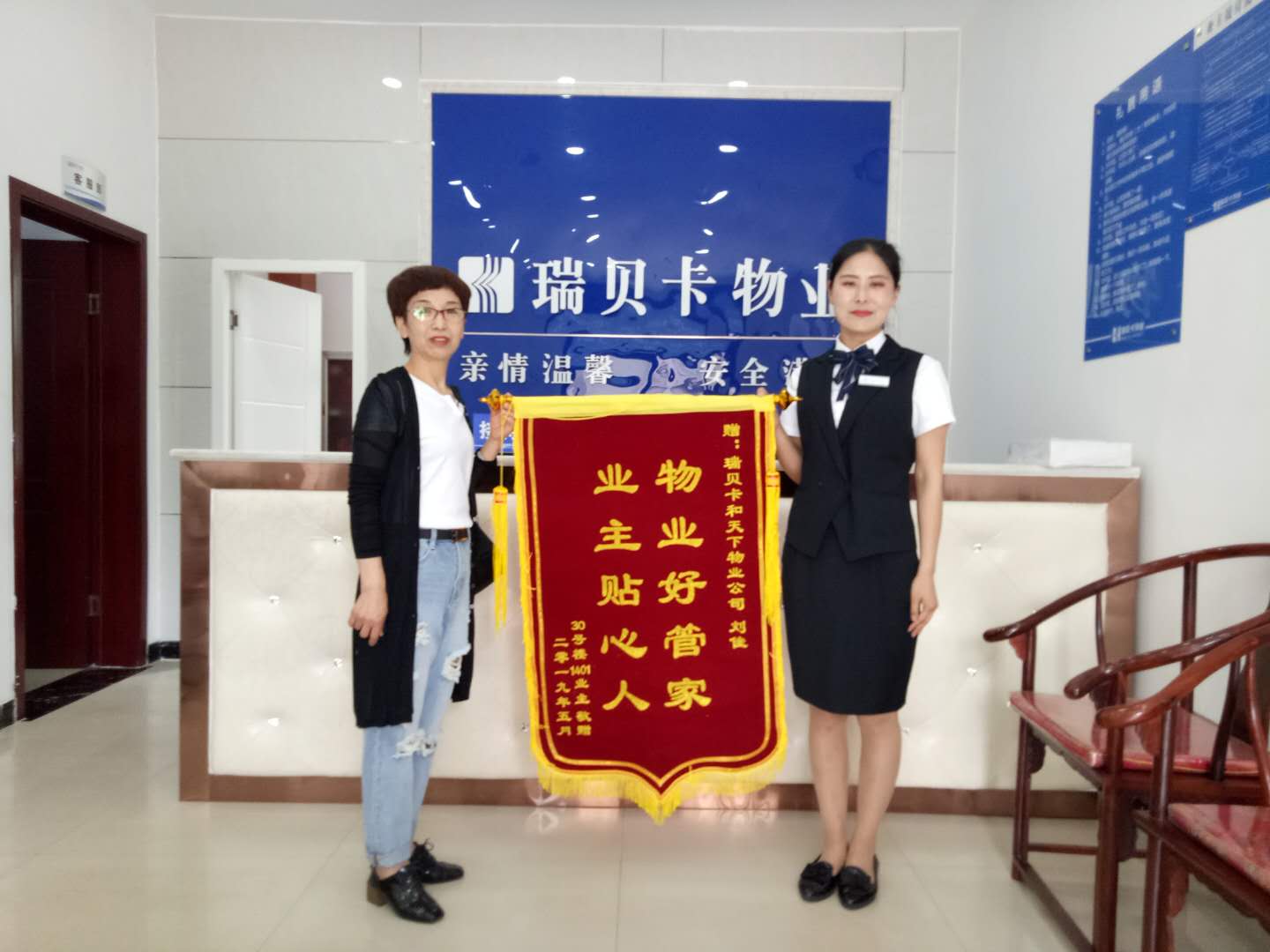 5月18日上午,和天下小區(qū)30號樓業(yè)主王女士將一面鐫刻有“物業(yè)好管家、業(yè)主貼心人”的錦旗送到了小區(qū)物業(yè)服務(wù)中心,向盡職盡責(zé)為業(yè)主服務(wù)的客服管家劉佳表示感謝。