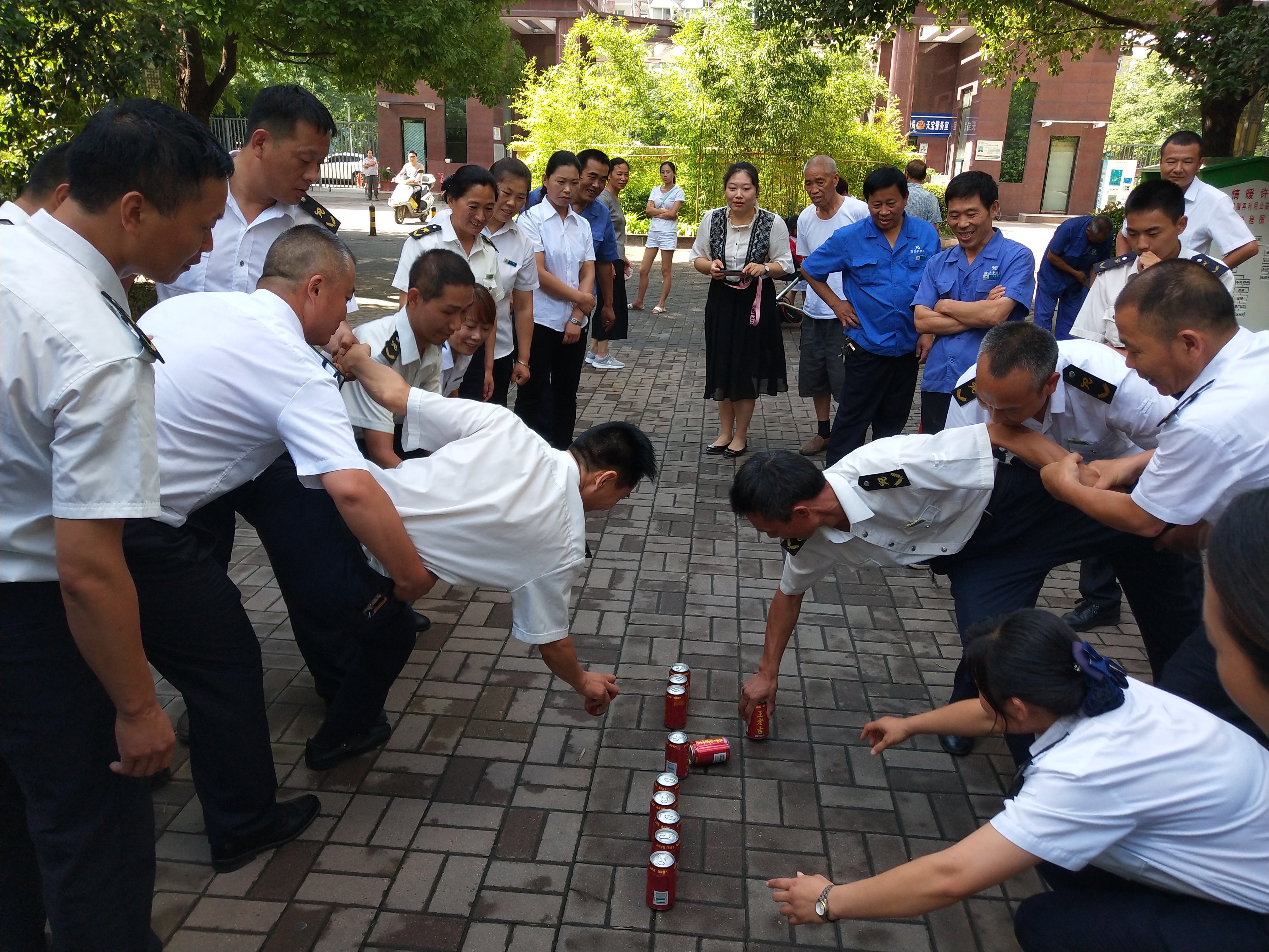 大家根據(jù)簽到順序,分成了A、B兩組,并根據(jù)意愿選出了呂偉亮和萬曉卿兩位隊(duì)長,開啟了第一個游戲——剪刀石頭布的比拼,一個傳統(tǒng)的游戲,但被我們玩出了另一番趣味。兩隊(duì)人相對而戰(zhàn),從第一個開始進(jìn)行剪刀石頭布的比拼,輸?shù)囊魂?duì)要全體站立說“抖一抖”,同時身體也要伴隨著一起抖動,看似玩法簡單卻蘊(yùn)含著很多小重點(diǎn)。首先大家必須要全神貫注地看著隊(duì)友間的比拼,因?yàn)樯圆涣羯�,就會錯過站起的時機(jī)而被淘汰。其次,也考驗(yàn)著大家的反應(yīng)能力,我們物業(yè)人,做任何事必須要迅速反應(yīng),因?yàn)槲覀儠r常會面對一些突發(fā)情況,而這些小游戲恰恰能潛在地鍛煉了我們的反應(yīng)能力。輸?shù)年?duì)伍全體站起后不僅要用嘴說,還要跟著身體抖動,這又剛好可以考驗(yàn)大家的身體協(xié)調(diào)。