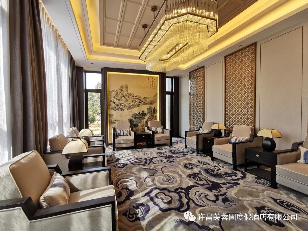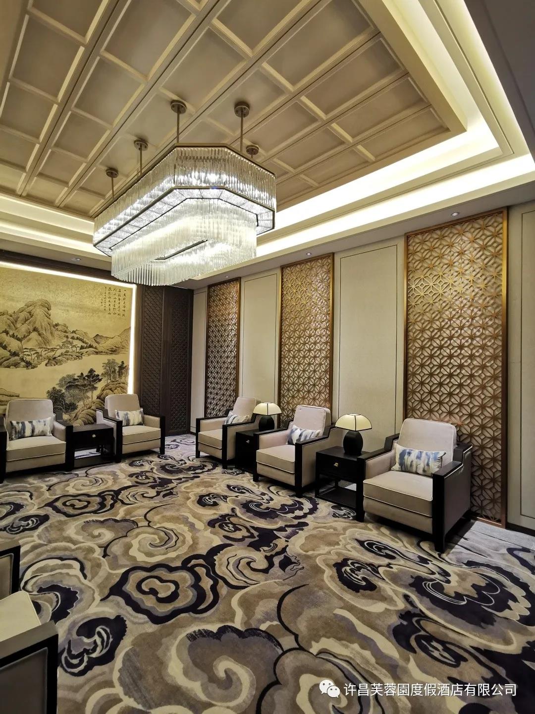 檏園一樓設有會見廳一間,可容納8-10人。藍白祥云地毯、山水畫、水晶吊燈、鏤空屏風等元素與樸素中式沙發(fā)椅的組合,是簡潔與復雜的巧妙融合,體現(xiàn)了莊重與優(yōu)雅的雙重氣質。