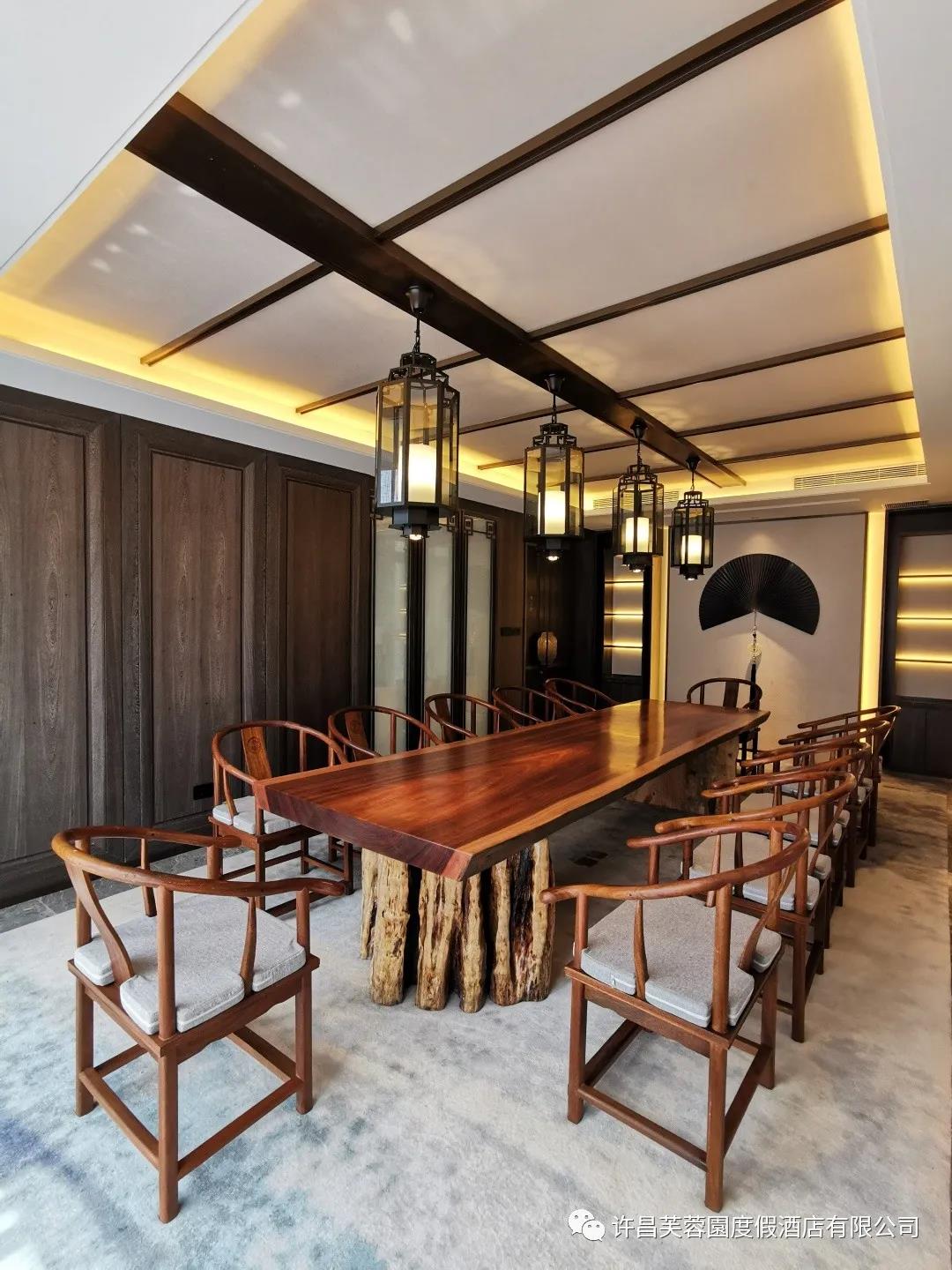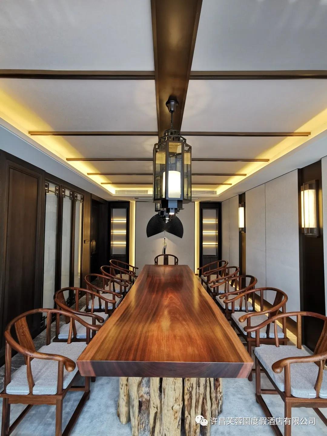 位于二樓,可容納12-14人。整體風格簡約自然,樹根雕飾、實木桌椅、宮廷鏤空吊燈等都體現(xiàn)了濃郁的東方之美。