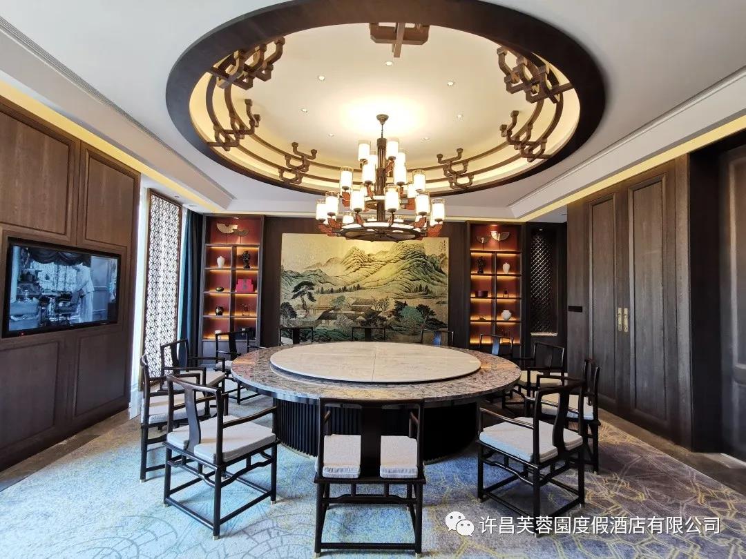 位于檏園一樓,可容納12-14人就餐。格調雅致,古色古香,幾乎占據(jù)整面墻的背景畫,名為“靈泉瑞溢”,乃許昌古十景之一。實木餐椅搭配大理石餐桌,柔和石材的硬朗,展現(xiàn)東方文化的內(nèi)斂氣息,一如中國的飲食文化,深厚廣博,暢神怡情。