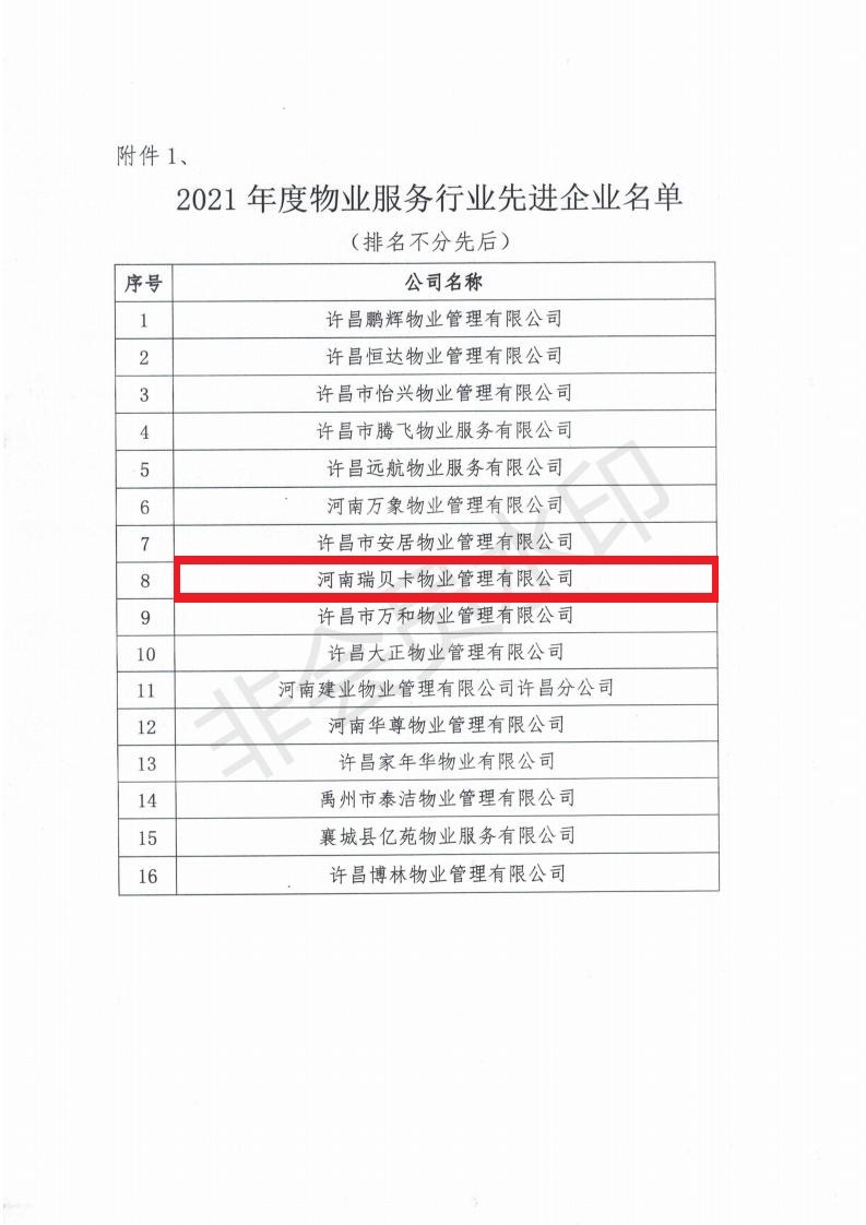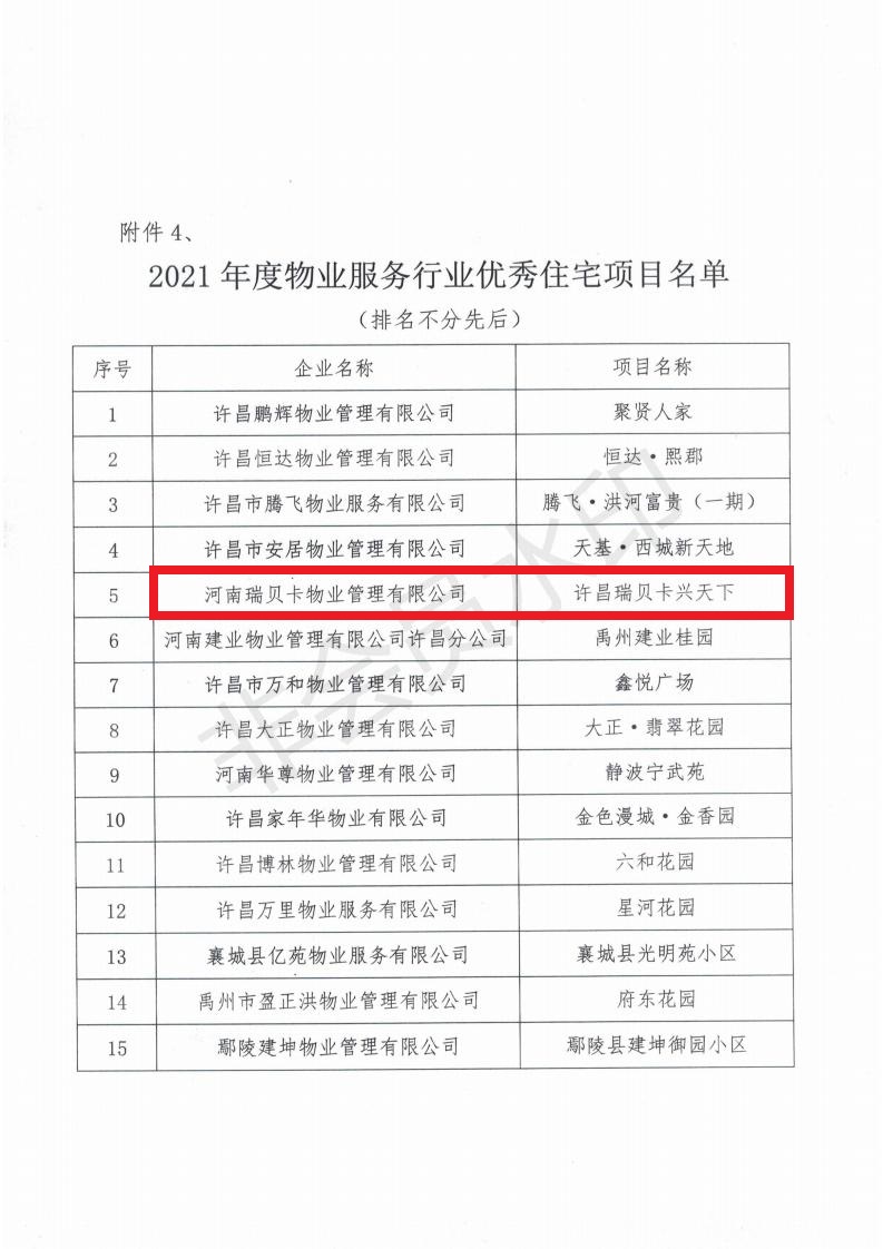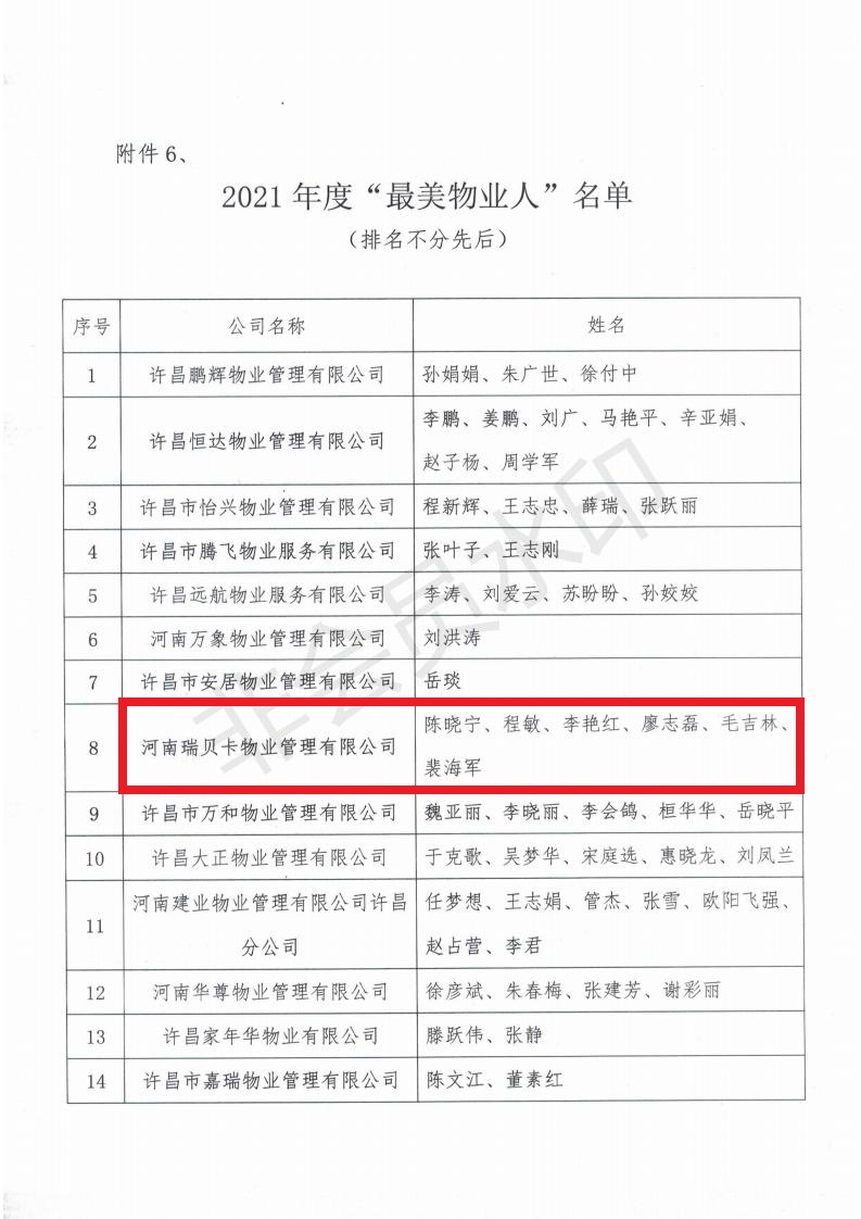 2月18日,許昌市物業(yè)管理協(xié)會(huì)發(fā)布《關(guān)于表彰2021年度許昌市物業(yè)服務(wù)行業(yè)先進(jìn)企業(yè)、項(xiàng)目和個(gè)人的決定》,瑞貝卡物業(yè)憑借領(lǐng)先的綜合實(shí)力、卓越的服務(wù)及管理水平,榮獲多項(xiàng)殊榮。其中,物業(yè)公司榮獲2021年度物業(yè)服務(wù)行業(yè)先進(jìn)企業(yè)榮譽(yù)稱(chēng)號(hào);許昌瑞貝卡興天下榮獲2021年度物業(yè)服務(wù)行業(yè)優(yōu)秀住宅項(xiàng)目榮譽(yù)稱(chēng)號(hào);瑞貝卡物業(yè)陳曉寧、程敏、李艷紅、廖志磊、毛吉林、裴海軍榮獲2021年度“最美物業(yè)人”榮譽(yù)稱(chēng)號(hào)!